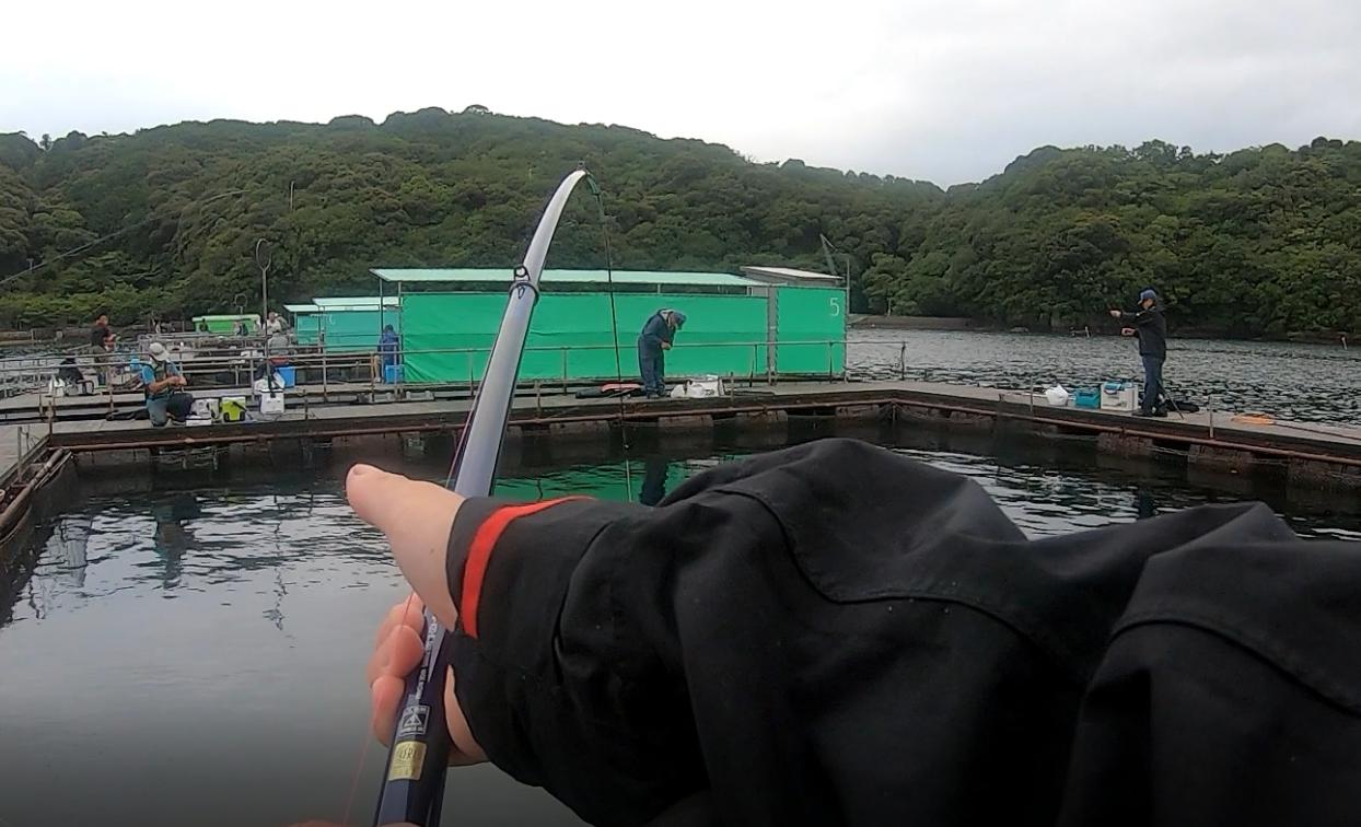 青が落ち着いたのでマダイを釣ろうとイケスの角地を探り始めます。マダイは食いこそ浅いものの、イケス全体で釣れていて飽きない程度にアタリがあります。