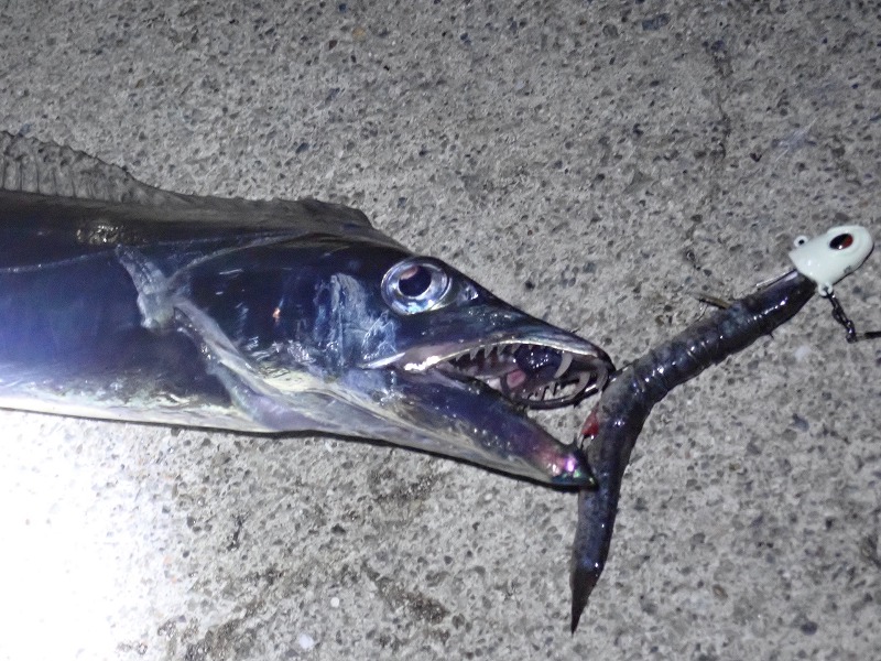 今度はワームをセットしてワインドの要領でアクションを入れながら誘ってみると、アタリはあるのですがなかなか乗りません。ワームはタチウオの鋭い歯で削れてボロボロ。これを掛けていくのが腕なんでしょうが、エサと違い食い込みがシビアになるので素直に餌釣りをしたほうが良いかなと思いました。