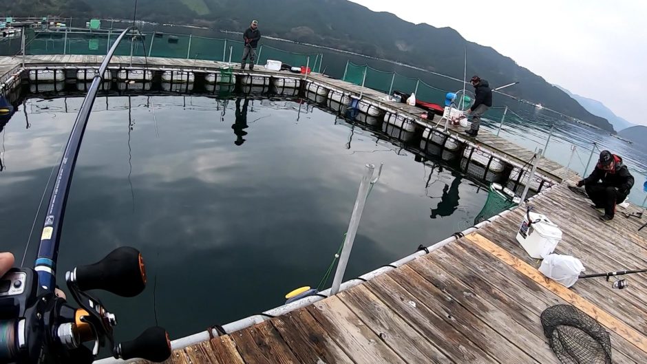 冬季の集合は6:00受付、6:30に船で沖の筏まで出船します。釣り堀としては一般的な施設ですが、スカリやタモは無料レンタルしてくれ、スカリは筏の上に用意されているので持ち運ぶのは釣りの道具だけでよいのは助かります。